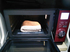 タオルを水で濡らして軽くしぼり(水が滴らない程度)、そのまま電子レンジに2分程度かけます。(50~60℃:熱くて触れるか触れないかくらい)