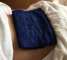 手で触って熱すぎるくらいに感じる状態の蒸しタオルを直接肌にのせ、そのままぬるくなるまで温めます。(およそ3~5分くらい)